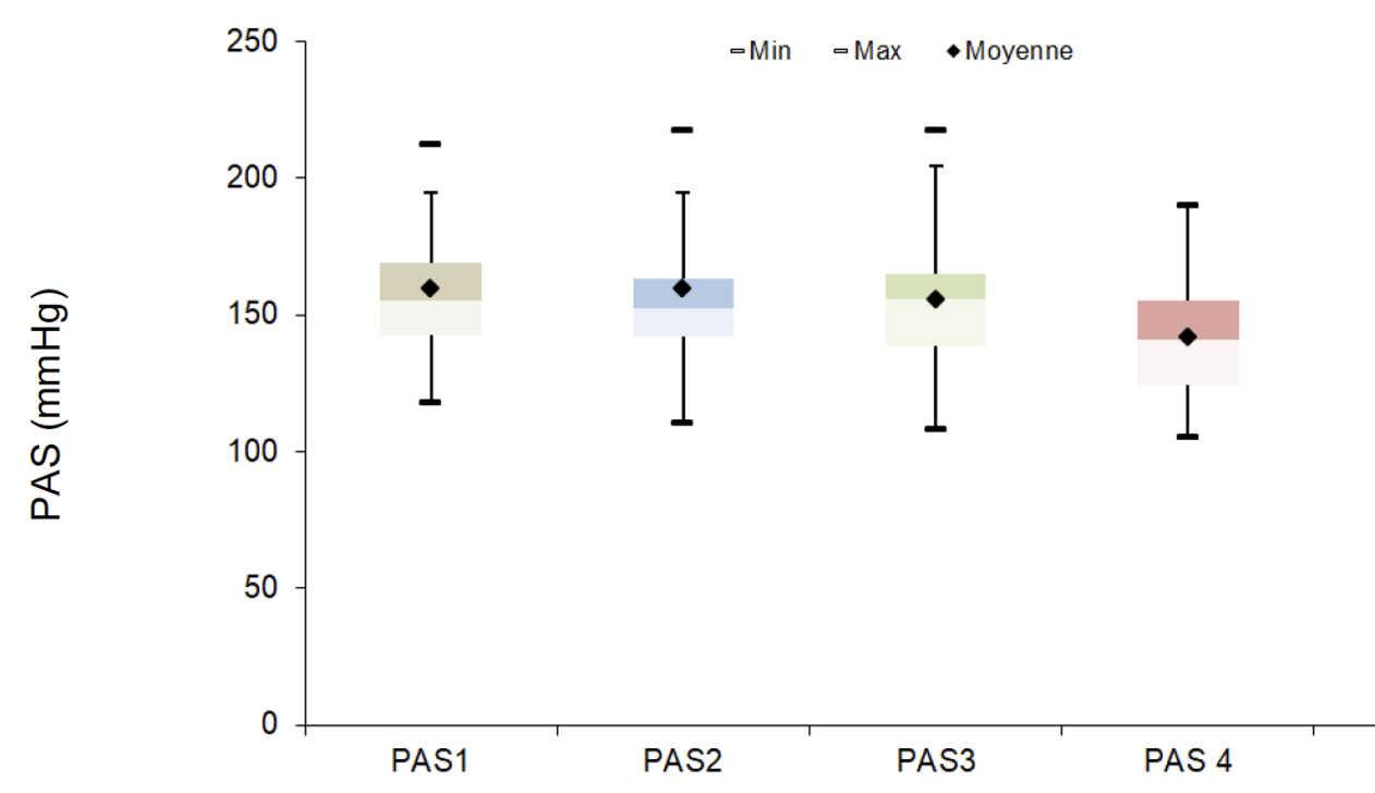 Boîte à moustache des valeurs de pression artérielle sanguine (PAS) obtenues, selon l'un des quatre contextes : PAS1, pris par le vétérinaire seul (en blouse) ; PAS2, par le propriétaire formé en présence du vétérinaire ; PAS3, par le propriétaire seul, au CHUVA ; PAS4 : par le propriétaire à domicile (J. Létondot, 2025).