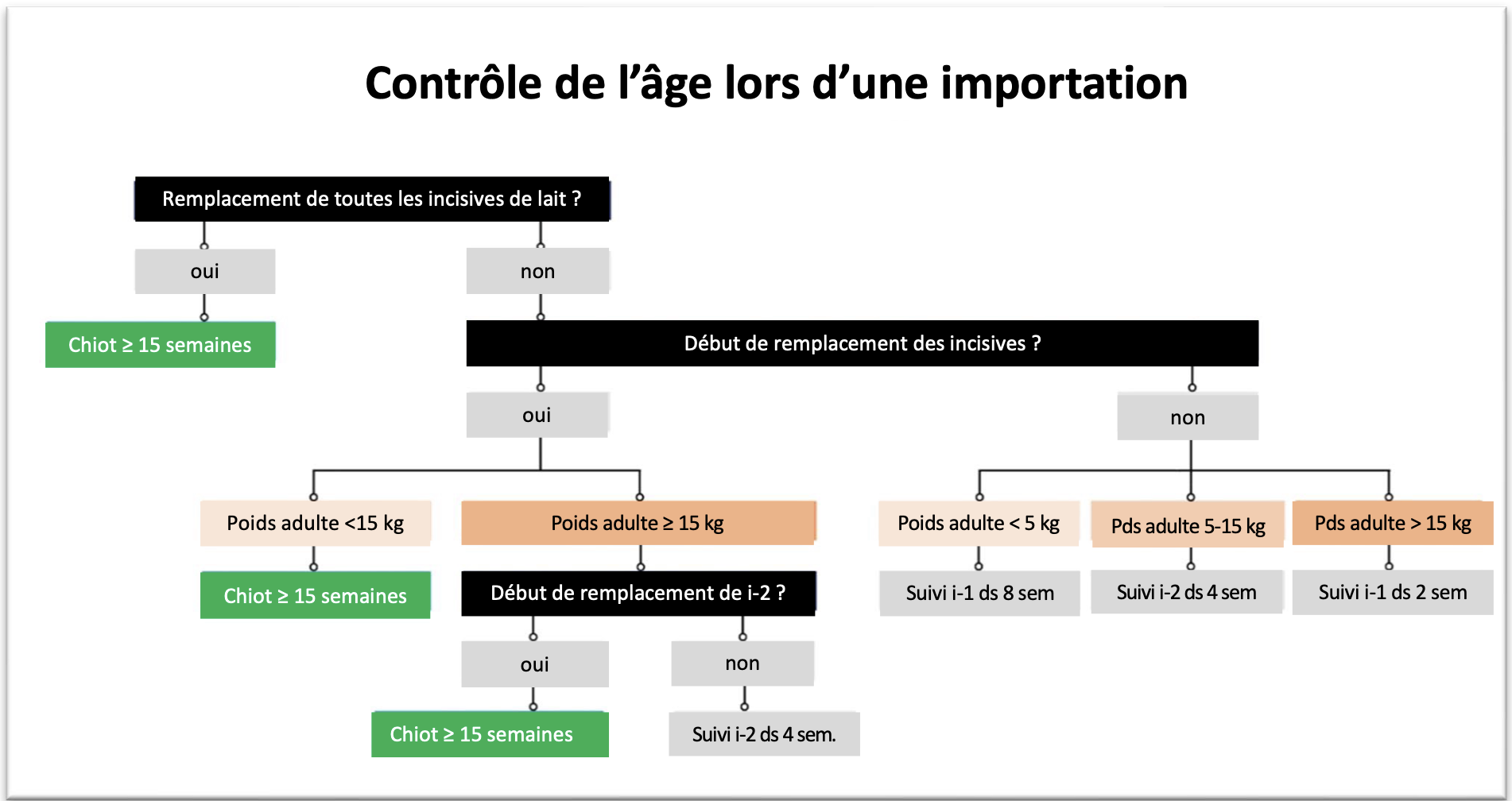 Selon la réglementation européenne, seuls des chiots âgés d'au moins 15 semaines (105 jours) peuvent être importés dans les États Membres à faible risque de rage. Les auteurs ont donc développé une conduite à tenir (voir la figure ci-dessous) permettant d'estimer si l'âge enregistré dans le passeport correspond à l'âge estimé en fonction du remplacement d'incisives. Tout d'abord, il est évalué si les 12 incisives déciduales ont été complètement remplacées. Si c'est le cas, il est certain que le chiot a plus de 15 semaines. Plus précisément, il est possible d'affirmer que des chiens des catégories 1, 2 et 3/4/5 auront au moins 21, 19 ou 18 semaines au moment où toutes les incisives du lait auront été changées.