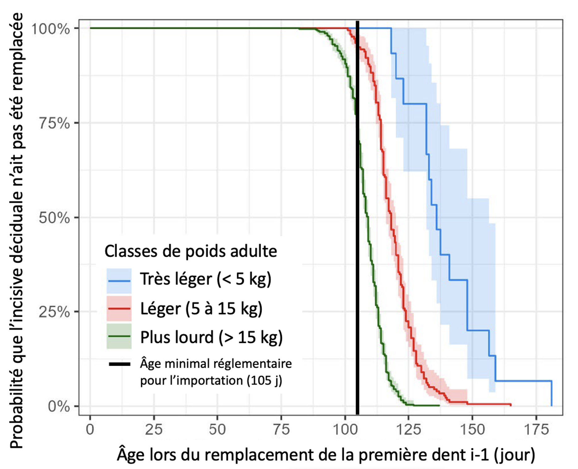 Courbe Kaplan-Meier de la probabilité que le remplacement de la première incisive i-1 (501, 601, 701 ou 801) n'a pas encore débuté, pour des chiens de différents catégories de poids à taille adulte. La zone plus claire autour des lignes représente l'intervalle de confiance à 95 %. D'après le rapport Leeftijdsbepaling van de hond aan de hand van het wisselpatroon van de snijtanden.