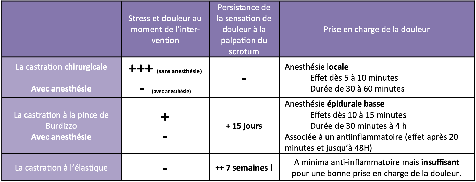 À noter que ces résultats confirment ceux obtenus en France, où trois méthodes de castration étaient comparées et pour lesquelles des gradients et des durées de douleur différents ont été observés (voir le tableau ci-dessous).