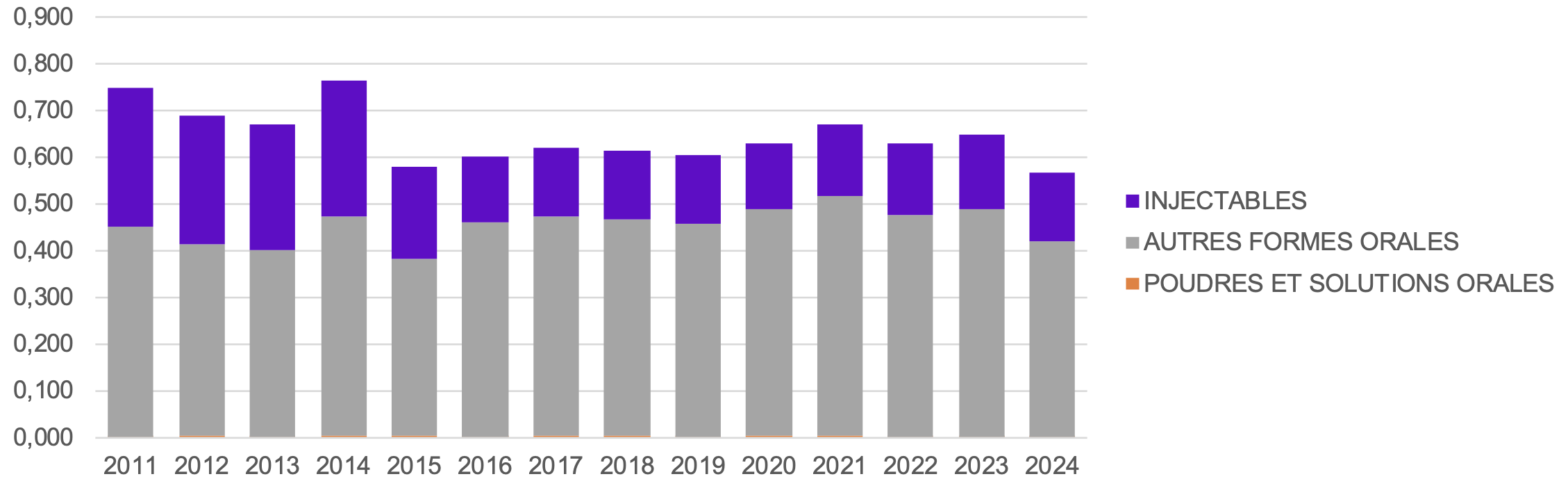 Évolution de l'exposition (en ALEA) aux antibiotiques, par forme pharmaceutique depuis 2011, pour les chats et les chiens en France (ANMV, 2025).