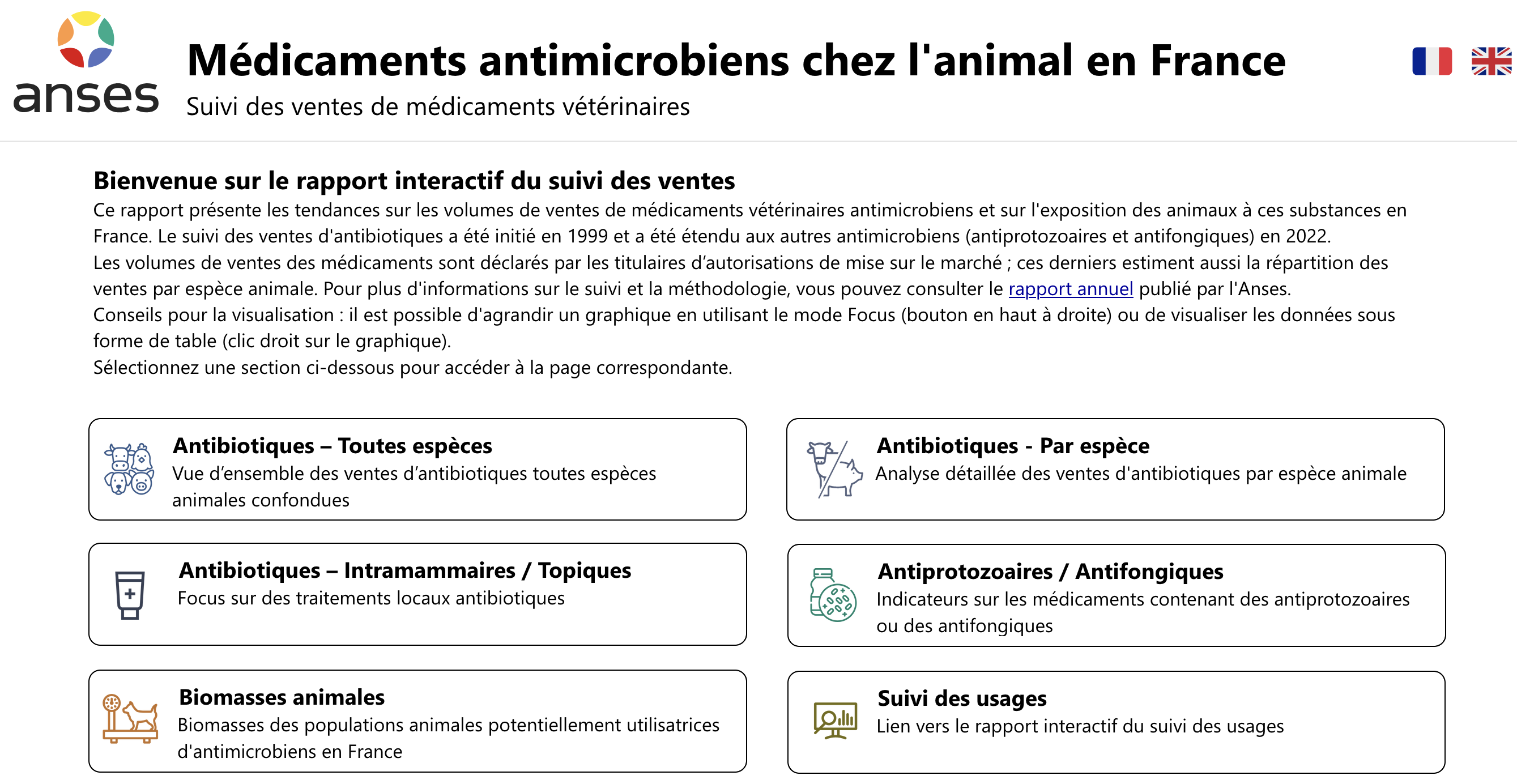Enfin, une version interactive du rapport a été mise en ligne par l'ANMV, qui permet d'accéder aux données pour toutes les espèces depuis 1999 ou bien par espèce animale, avec différentes unités (tonnage, mg/kg, ALEA…) ou à celles de biomasse animale, ou encore à celles relatives aux traitements intramammaires et topiques (voir l'illustration ci-dessous). Pour celles des traitements antiprotozoaires et antifongiques, les données démarrent en 2022.
