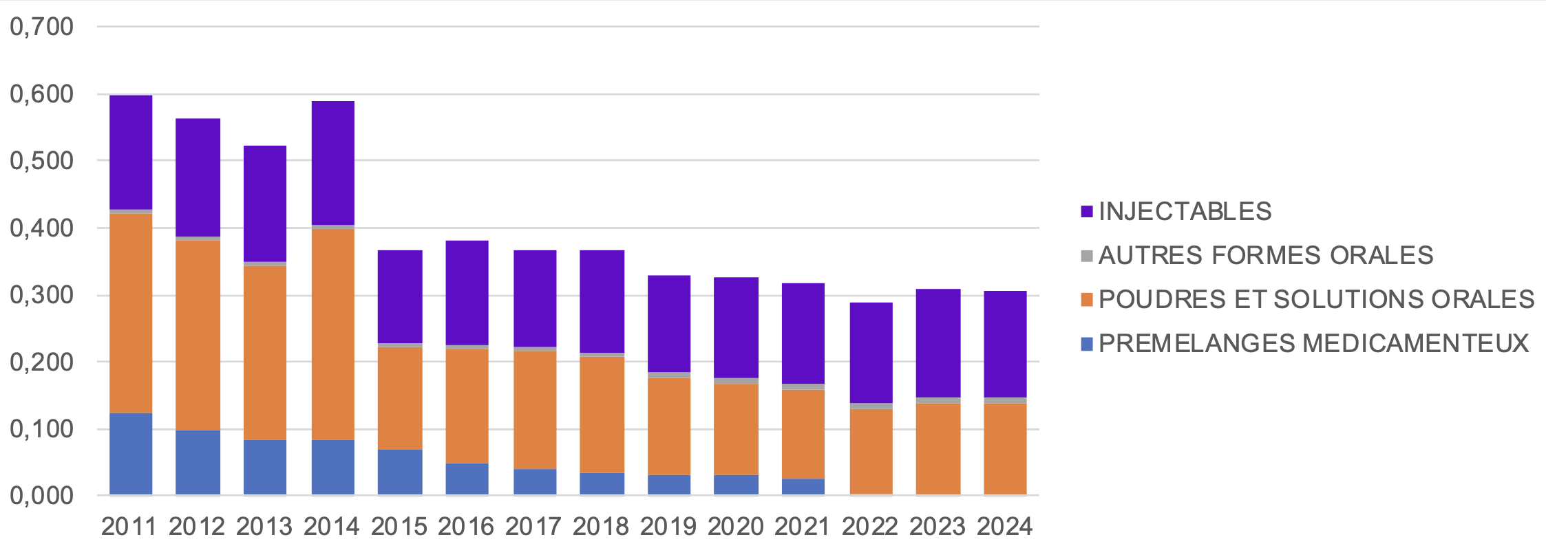 En 2023, l'exposition globale (mesurée en ALEA) des animaux domestiques en France était à 0,309. Cette année, elle est à 0,307. Cela reste « une valeur proche mais néanmoins très légèrement supérieure à l'objectif fixé [par le] plan Ecoantibio 3, [qui] est de maintenir cet indicateur en dessous de 0,3, valeur correspondant à une réduction d'environ 50 % de l'exposition depuis 2011 ». De fait, en 2024, « l'exposition des animaux aux traitements antibiotiques a diminué de 48,7 % toutes espèces confondues par rapport à 2011 » (voir l'illustration principale). En volume, ce sont 276 t de matière active qui ont été vendues en 2024, dont 28 % de tétracyclines et 23 % de pénicillines. Ce qui est très stable par rapport à 2023 (alors à 275,87 t) et depuis 2022.