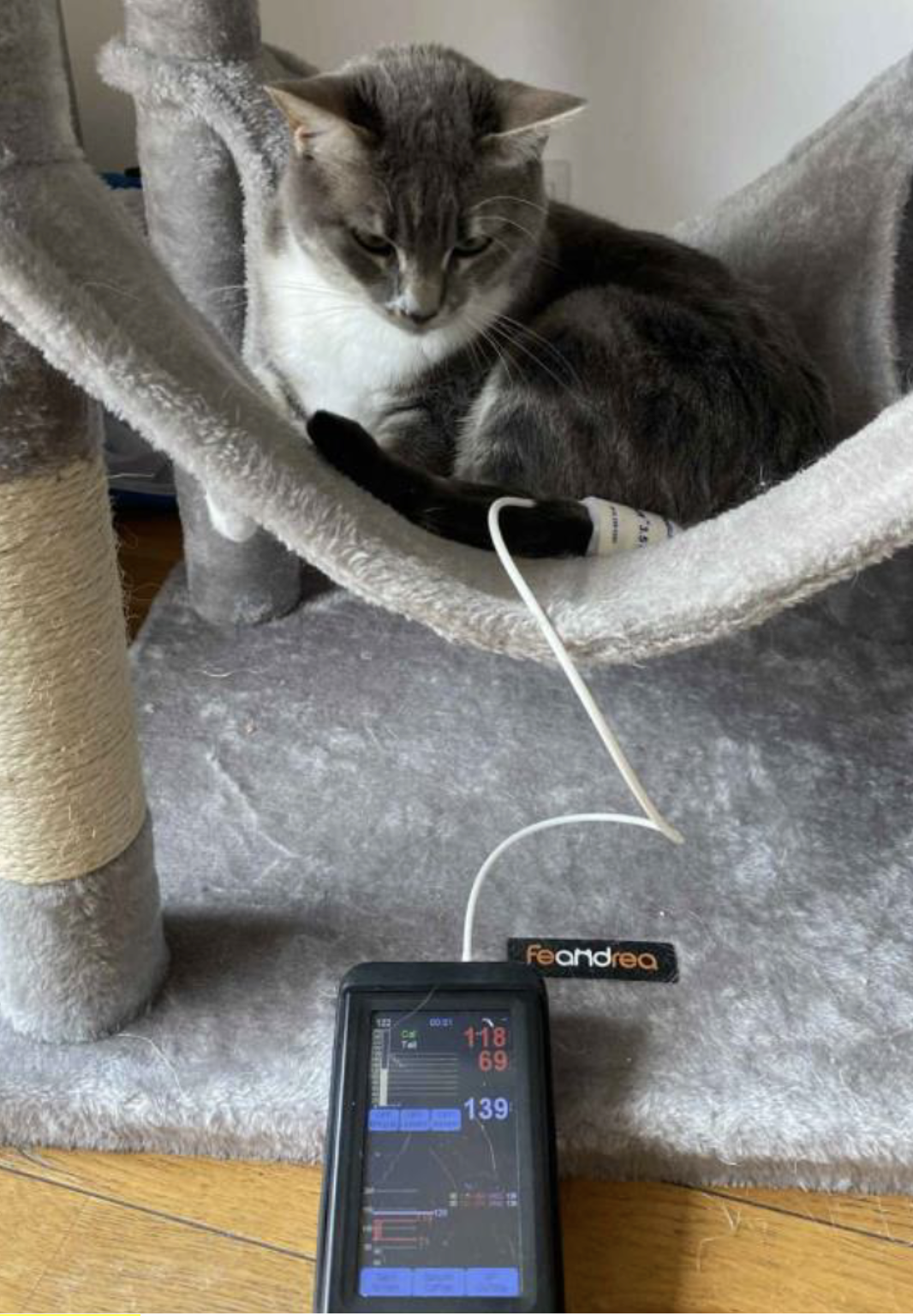 Tout praticien sait que la clinique n'est pas l'environnement le plus propice pour la mesure correcte de la tension artérielle chez le chat. Le diagnostic d'hypertension artérielle féline repose souvent sur des critères indirects : des valeurs tensionnelles élevées répétées, et/ou la présence de lésions des organes cibles. Mais comment quantifier ou contourner l'effet “blouse blanche ” – c'est-à-dire le stress induit par la fréquentation de la clinique, justement ? Cela a été l'objet d'une thèse vétérinaire récente, en se basant sur un échantillon de chats reçus au Centre hospitalier universitaire vétérinaire d'Alfort (CHUVA). Vingt-cinq chats ont été recrutés entre mars 2024 et juin 2025 : des chats sains, suspects d'hypertension ou hypertendus avérés. Les sujets agressifs ou recevant un traitement susceptible d'influencer la pression artérielle (PA) ont été exclus, tout comme des propriétaires déjà formés à la prise de PA (comme des médecins ou infirmières).