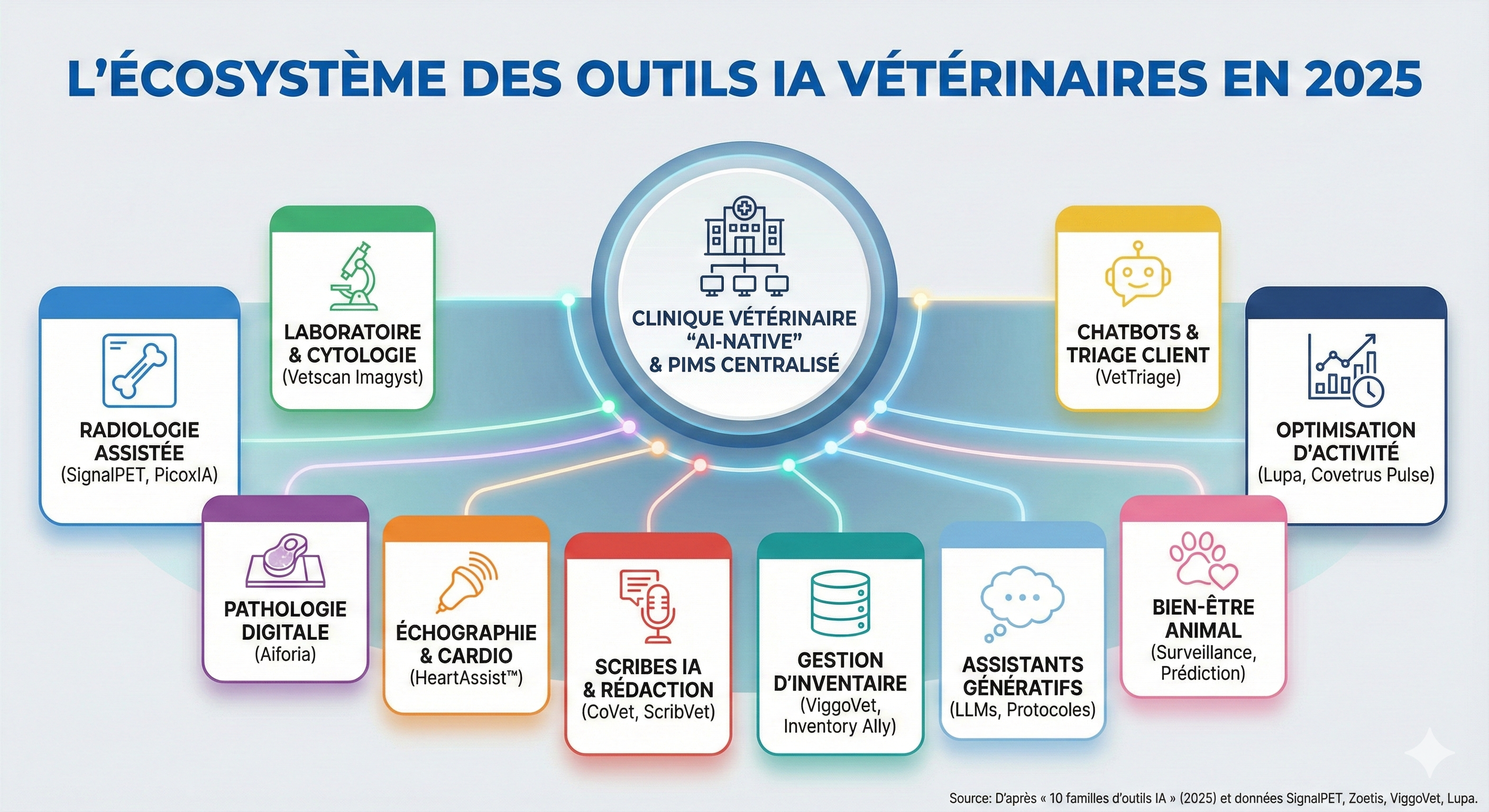 De la radiographie à la relation client, les algorithmes s'invitent partout dans la pratique vétérinaire. Ce Fil recense les principaux outils d'usage courant en 2025 en médecine vétérinaire exploitant l'intelligence artificielle (IA).