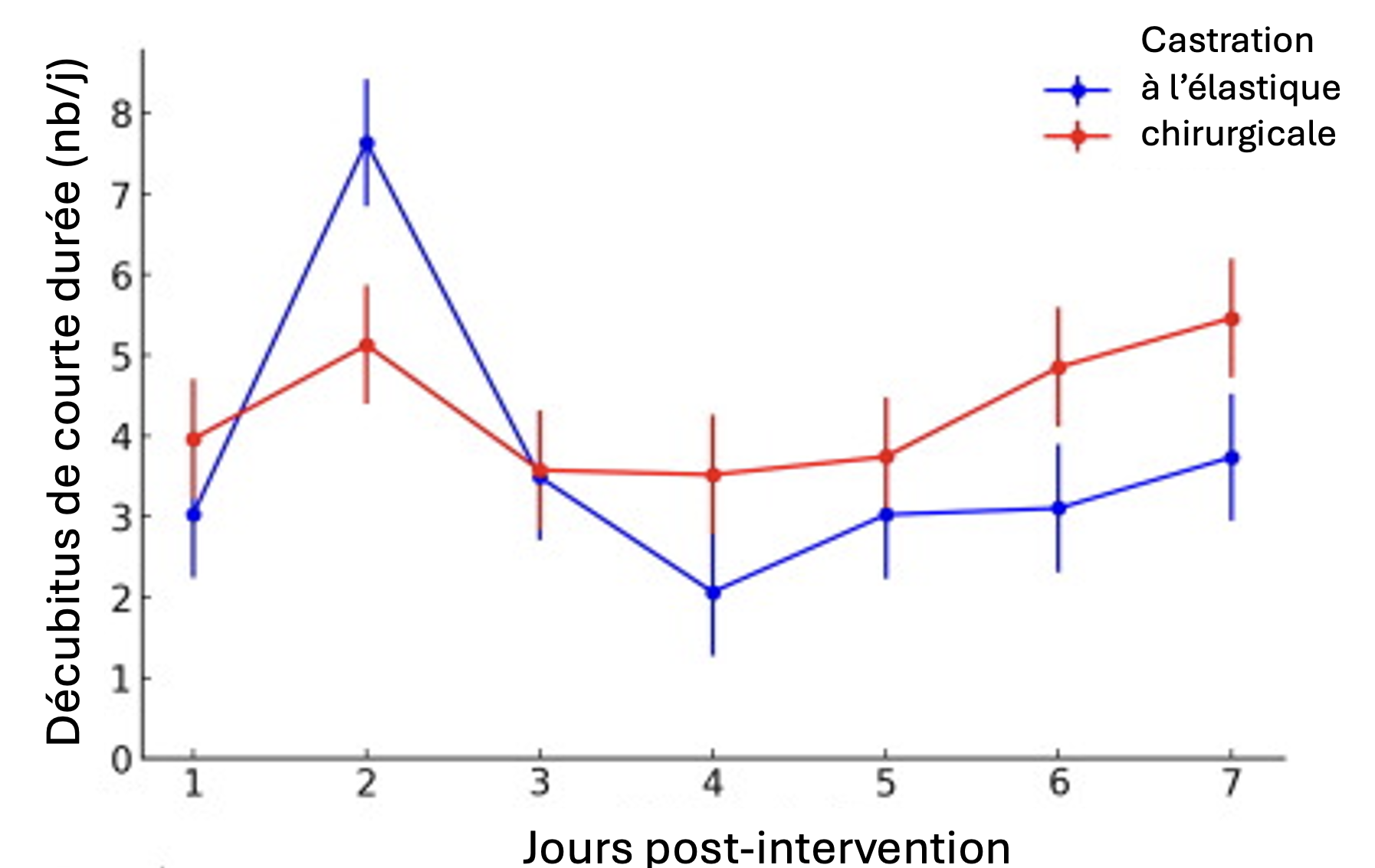 La fréquence des périodes de couchage incomplètes n'a pas permis d'objectiver la douleur, ce critère étant de plus très variable : 11 veaux sur 34 n'ont présenté aucune période de couchage incomplète durant la première semaine suivant la castration. Pareillement, les expériences sur la mémoire spatiale n'ont pas permis de mettre en évidence des différences liées à la douleur, peut-être trop subtiles pour affecter la cognition, ou manquant de sensibilité pour détecter des déficits légers. En revanche, les courtes périodes de décubitus sembleraient constituer un indicateur sensible et pratique pour l'évaluation de la douleur post-castration dans de futures recherches.