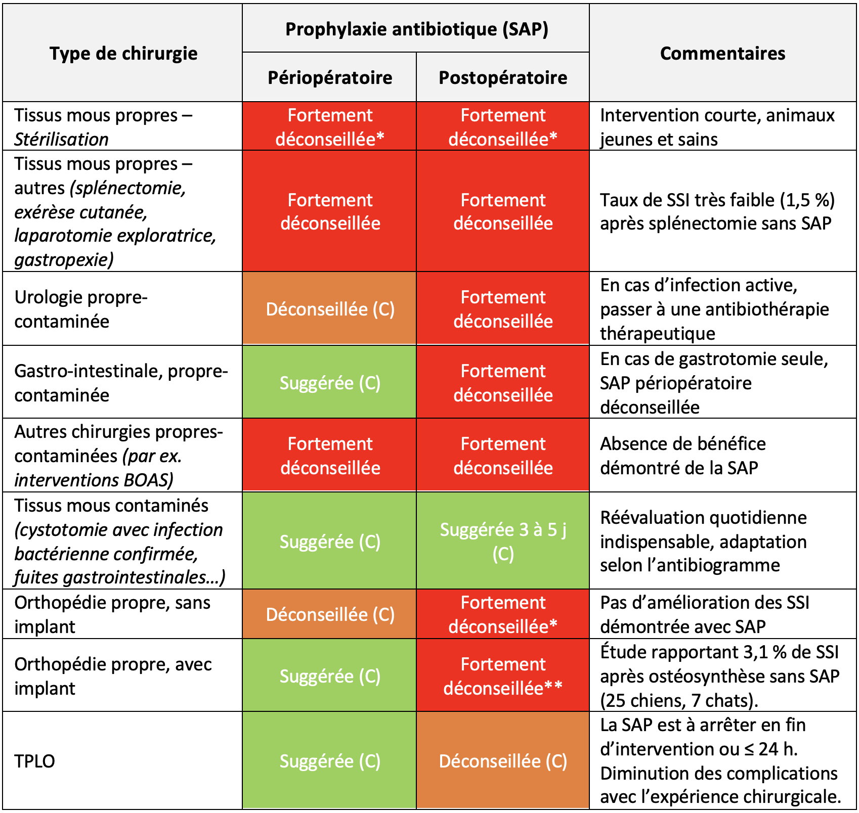 Les recommandations fortes s'appuient généralement sur des preuves de certitude modérée à élevée, mais peuvent aussi être émises lorsque des preuves limitées suggèrent une absence de bénéfice clinique, alors que les effets indésirables de la SAP, comme ses effets secondaires (dysbiose ou encore le risque d'antibiorésistance) sont bien établis. Les recommandations conditionnelles reflètent soit un faible niveau de certitude, soit une variabilité attendue selon les patients, leurs propriétaires ou les contextes régionaux. Elles laissent une marge de décision clinique individualisée.