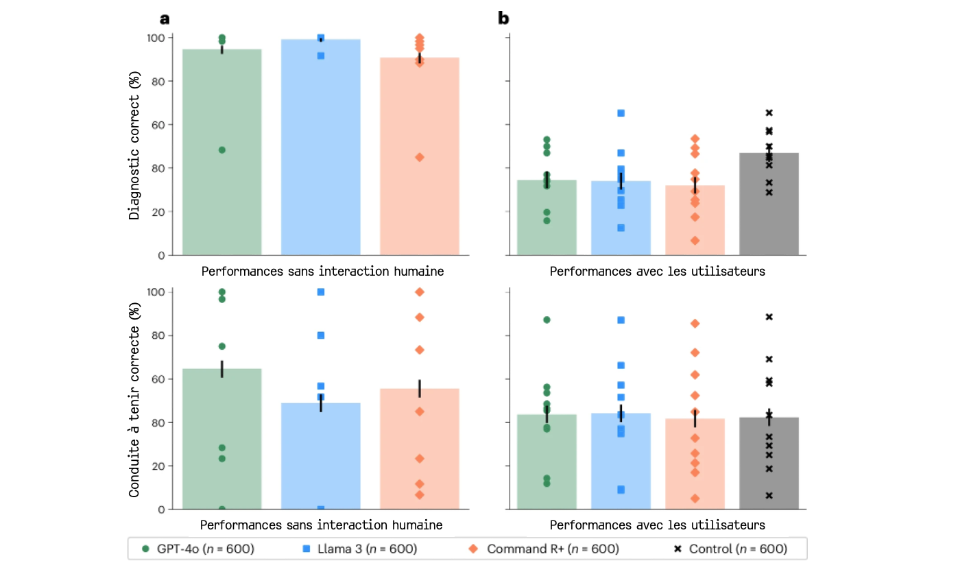 Testés seuls, avec les mêmes scénarios, et répondant directement aux mêmes questions finales, sans interaction humaine, les modèles étaient parvenus à un bon diagnostic dans 90,8 à 99,2 % des cas suivant l'outil. Et ils avaient proposé la bonne conduite à tenir dans 48,8 à 64,7 % des cas (voir graphique plus haut).