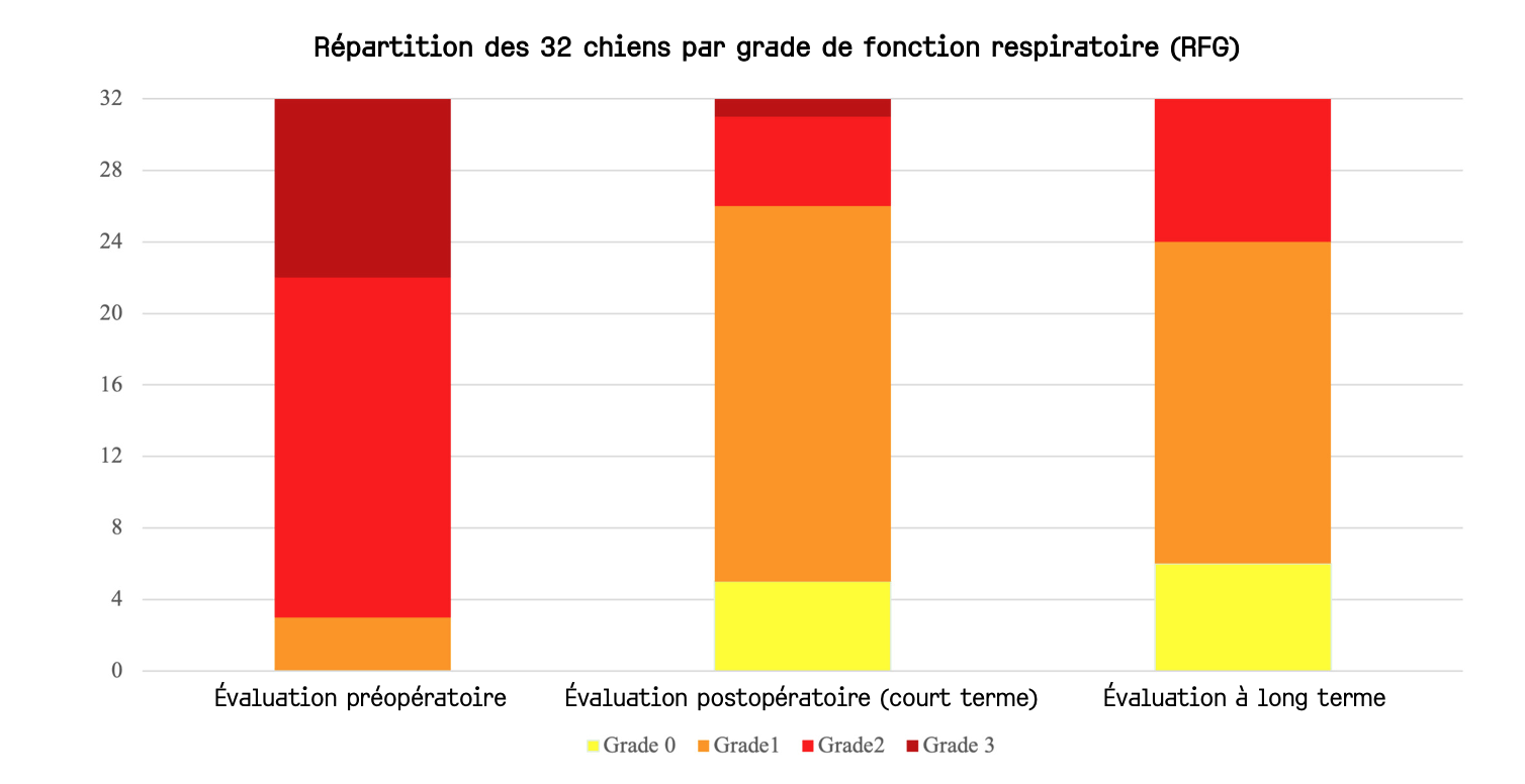 Les résultats montrent une amélioration significative à court terme des paramètres respiratoires. Ainsi, avant l'intervention, seuls 3 chiens étaient de grade RFG 0 ou 1, tandis qu'ils étaient 26 au suivi postopératoire. Et l'index BOAS moyen est passé de 71,6 % avant la chirurgie à 46,7 % après.