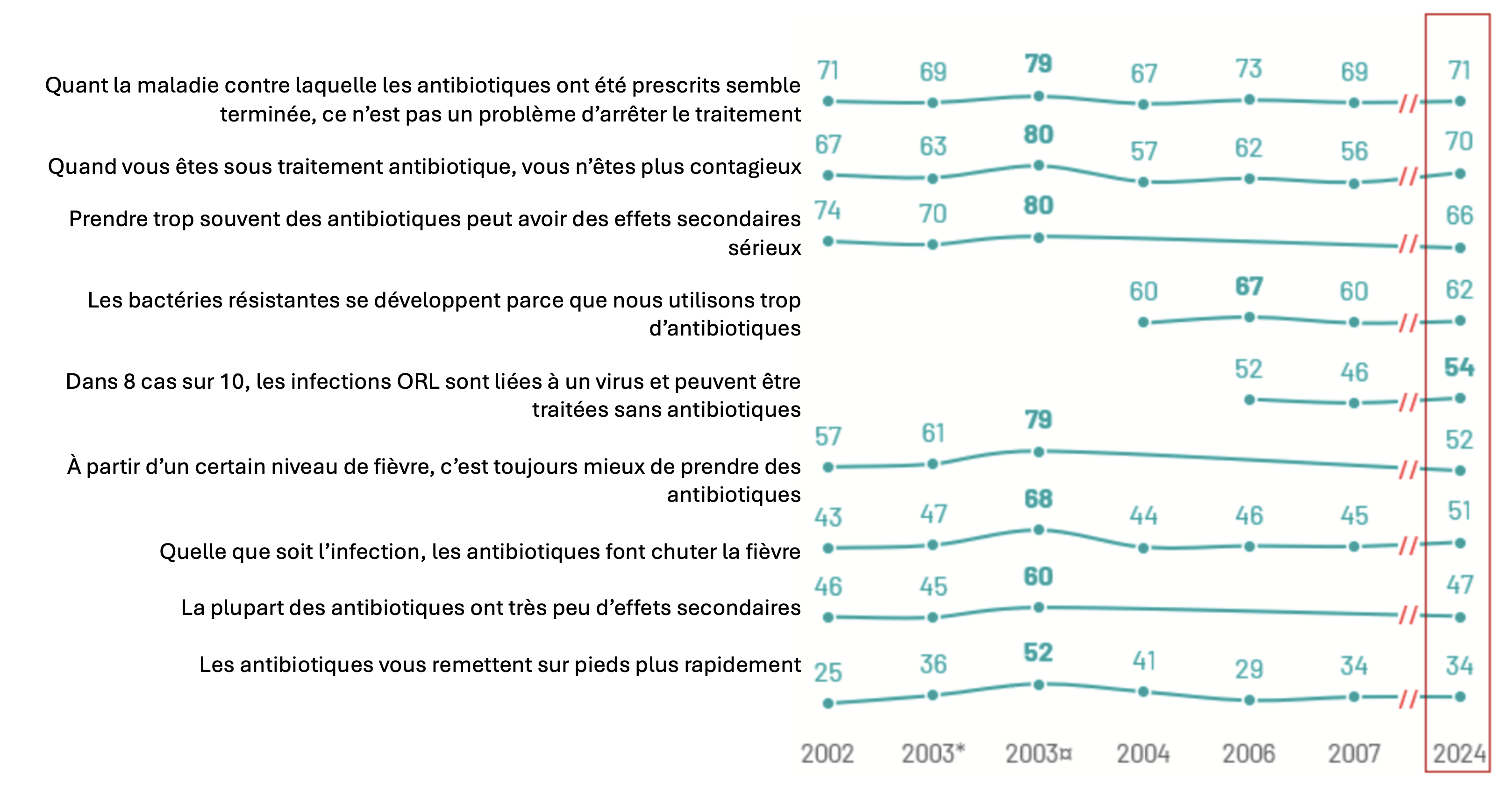 Pourcentage de réponses correctes sur les antibiotiques au fil 22 dernières années (même questionnaire, même méthodologie d'enquête). Les chiffres en gras indiquent le pourcentage maximal observé au fil des années. Lanoix, 2025.