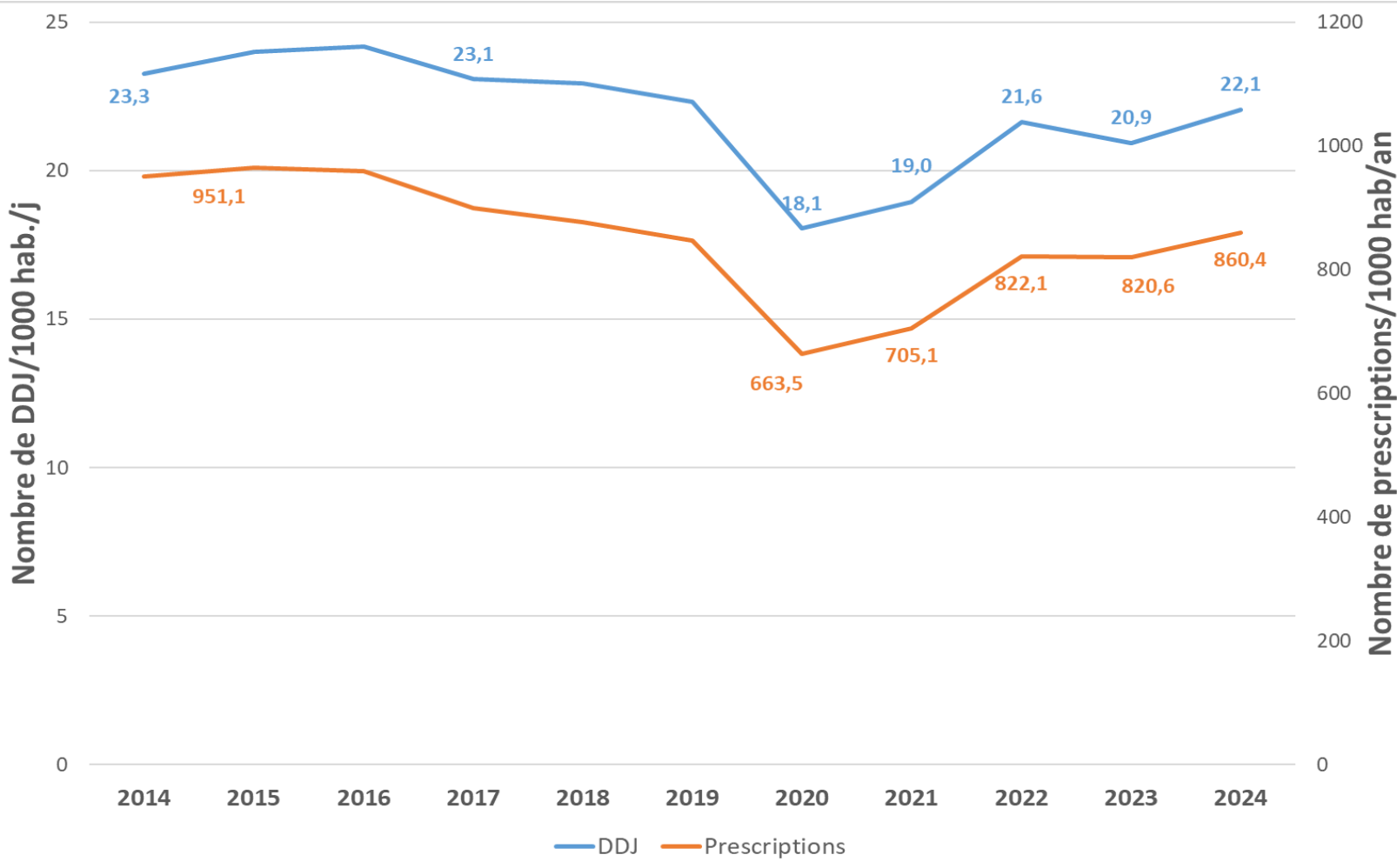 Les trois principales catégories de prescripteurs sont les médecins généralistes (75,6 % du total des prescriptions), les médecins spécialistes (12,2 %) et les chirurgiens-dentistes (11,9 %). Les premiers sont en nette augmentation sur un an (+6,2 %), les seconds de manière plus limitée (+1,5 %) et les derniers en stagnation (-0,2 %). Au plan régional, les mêmes classements qu'en 2023 prévalent : « les régions Corse et PACA sont les régions dans lesquelles la consommation en DDJ et les prescriptions sont les plus élevées, tandis que les régions Pays de la Loire, Bretagne, Auvergne-Rhône-Alpes ainsi que les régions d'Outre-Mer restent celles dans lesquelles elles sont les plus faibles ». Cette cartographie est le résultat d'une lente évolution : sur 10 ans (2014-2024), les consommations d'antibiotiques ont reculé en Bretagne (-7,5 %) et en Île-de-France (-9,5 %) mais augmenté en PACA (+2,5 %) et en Corse (+17,5 %).