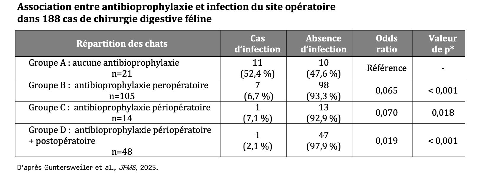 Le risque d'ISO est associé à plusieurs paramètres dans l'analyse univariée (âge du chat, localisation de l'intervention, durée de l'anesthésie et antibiothérapie). Mais dans l'analyse multivariée, seule l'administration d'antibiotiques demeure liée au risque d'infection, lequel est alors significativement réduit.