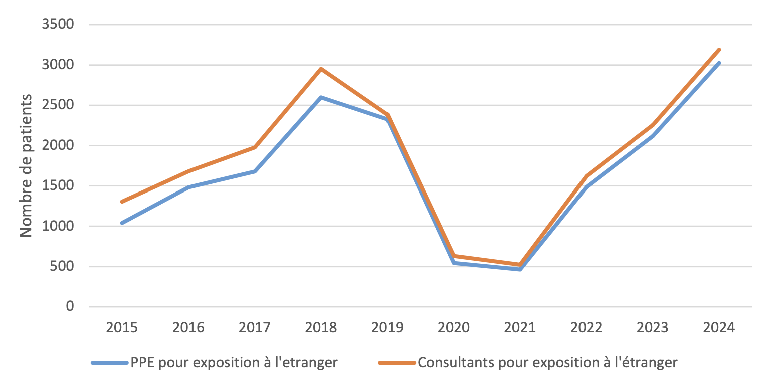 Ces rapporteurs relèvent que, « depuis 2021, [il y a] une augmentation continue des consultations et des prophylaxies post-exposition (PPE) délivrées suite à une exposition à l'étranger ». Ainsi, pour 2024, dernière année renseignée, « le nombre de consultations et de PPE concernant des voyageurs est en augmentation de 41 % et 43 % respectivement par rapport à 2023 et dépasse les valeurs pré-pandémiques [voir l'illustration principale]. Cette tendance est principalement en rapport avec une augmentation des consultations de voyageurs vers l'Afrique (+55 %) et l'Asie (+37 %) ».