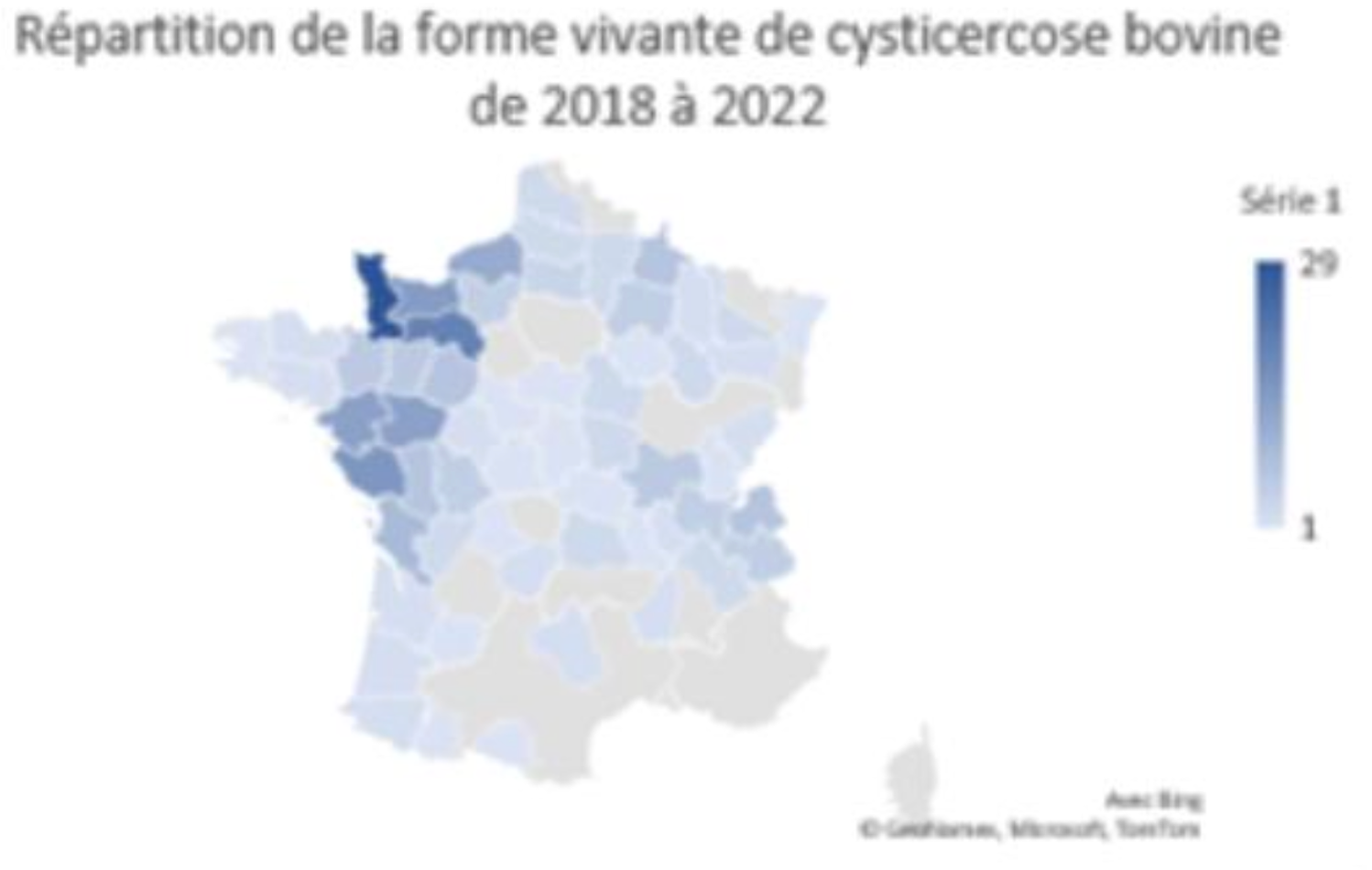 La cysticercose bovine est surtout détectée (à l'abattoir) dans le grand ouest, avec trois départements particulièrement concernés : le Calvados, l'Eure et la Manche. Ailleurs en France, elle est en baisse régulière. C'est ce que relève une thèse vétérinaire récente, dans laquelle l'alors future consœur a analysé les données collectées dans les abattoirs de métropole de 2018 à 2022.