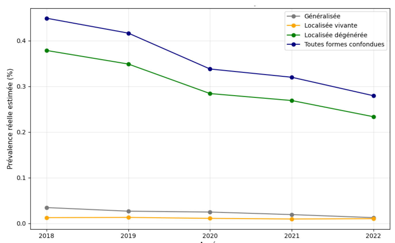 L'auteure a extrait les données du Système d'Information sur l'Inspection en Abattoir (SI2A) d'une part, et de la base de données nationale d'identification (BDNI) d'autre part. Cela lui a permis de calculer une prévalence apparente pour les différentes formes de cysticercose motifs de saisie : généralisée, localisée avec forme vivante ou dégénérée. Elle présente aussi leur répartition géographique et temporelle, la prévalence réelle et enfin les facteurs de risque de détection en abattoir. Au total, sur la période, l'inspection post-mortem a détecté 45 952 cas de cysticercose sur 22 494 468 carcasses de bovins. La prévalence apparente est en net recul à l'échelon national sur la période étudiée, passant de 0,057 pour cent carcasses inspectées en 2018 à 0,037 % en 2022 (0,047 % en moyenne sur la période). Toutefois, la sensibilité de la détection post-mortem à l'abattoir est limitée (13 % toutes formes confondues), et donc le calcul de prévalence réelle fournit une valeur de 0,362 % sur la période (contre 1,07 % en 2015), avec une tendance à la réduction au fil du temps (voir l'illustration principale).