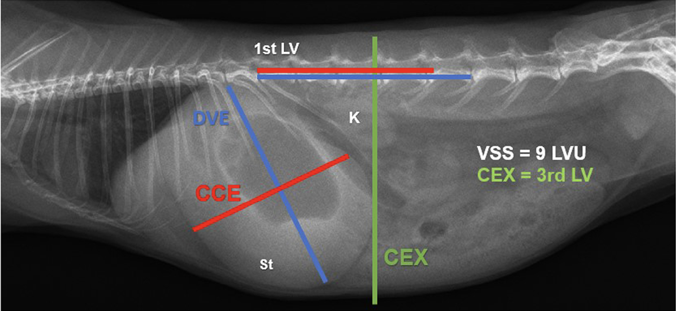 Pour l'évaluation de la taille gastrique sur la radiographie, une méthode comparable au score cardiaque vertébral a été développée par ces deux auteures : le score stomacal vertébral (VSS, voir l'illustration principale). Le VSS peut être calculé en utilisant des radiographies latérales et implique d'effectuer cinq mesures sur le cliché. La hauteur gastrique ou extension dorso-ventrale (DVE) et la longueur gastrique ou extension cranio-caudale (CCE) sont mesurées perpendiculairement l'une par rapport à l'autre.
