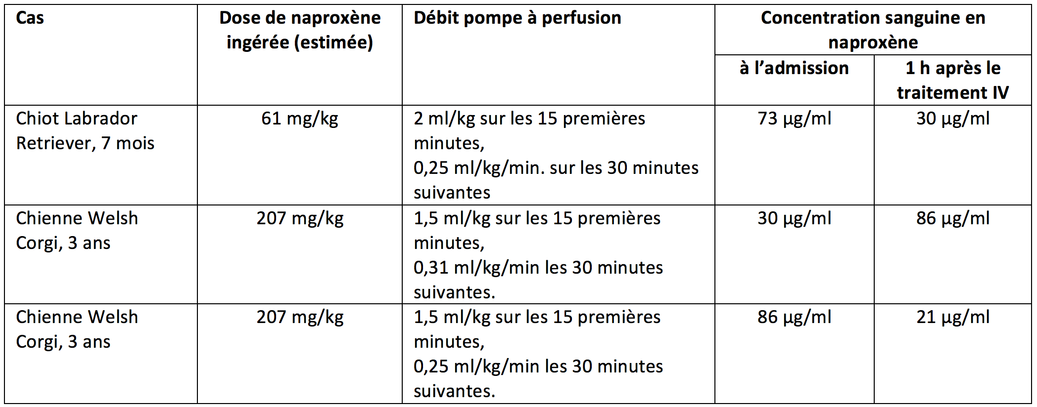 Chez le chien, les effets indésirables du naproxène apparaissent à partir de 5 mg/kg, et les signes neurologiques à partir de 50 mg/kg. Dans les trois cas décrits par l’université de l’Illinois, la quantité ingérée dépassait 60 mg/kg (dont deux cas au-dessus de 200 mg/kg). L’administration IV de l’émulsion lipidique a été réalisée sous surveillance des fréquences cardiaque et respiratoire ainsi que de la température rectale, toutes les 5 minutes au cours des 15 premières minutes, puis tous les quarts d’heure. Elle était réalisée via pompe à perfusion, avec un débit différent pour chaque cas (voir le tableau 1). Dans les trois cas, ce traitement a permis de réduire la concentration sanguine en AINS, et n’a été suivi d’aucun effet indésirable.