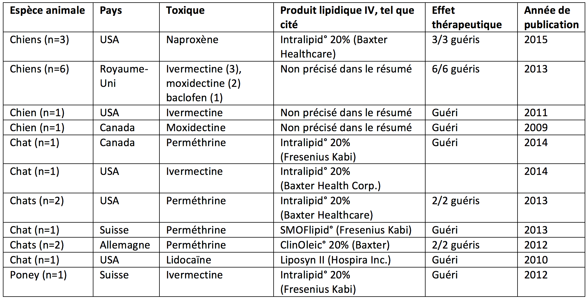 Principales séries de cas publiées sur le traitement par infusion d’une émulsion lipidique dans la prise en charge d’intoxications aiguës par des xénobiotiques chez le chien et le chat. A noter que le chat intoxiqué à la perméthrine et traité en Suisse l'a été par injection de bolus successifs. Les autres animaux ont eu une perfusion continue (pompe à perfusion).