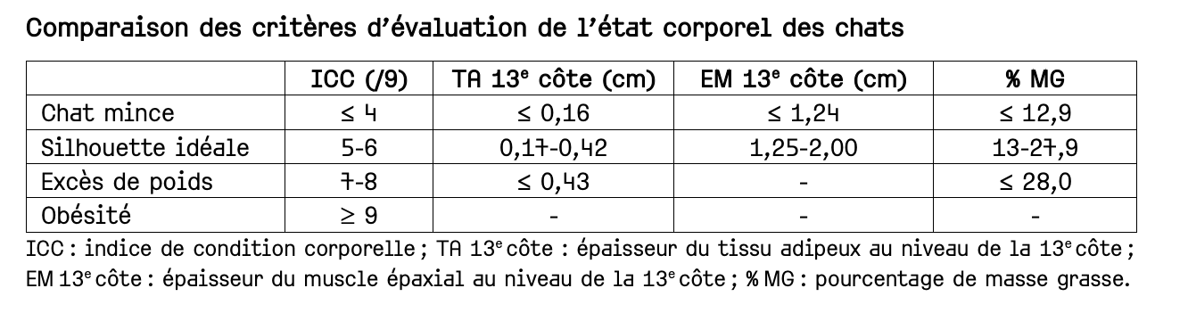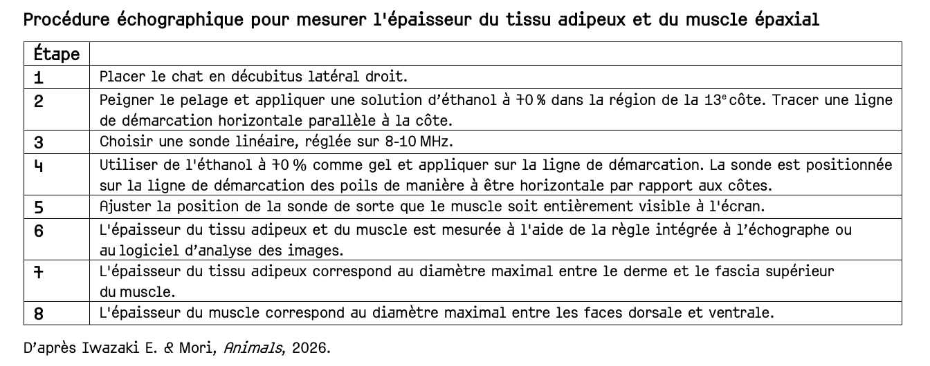 Chez le chat, l'état corporel est habituellement apprécié via l'indice de condition corporelle (ICC), évalué sur une échelle de 1 à 9, et l'indice de masse musculaire (IMM). Ces indices reposent toutefois sur des évaluations subjectives, réalisées par inspection visuelle et palpation. Leur reproductibilité est faible car les résultats varient selon l'évaluateur. En alternative, des chercheurs japonais présentent une méthode d'évaluation plus objective de l'état corporel des chats, qui s'appuie notamment sur des mesures échographiques.