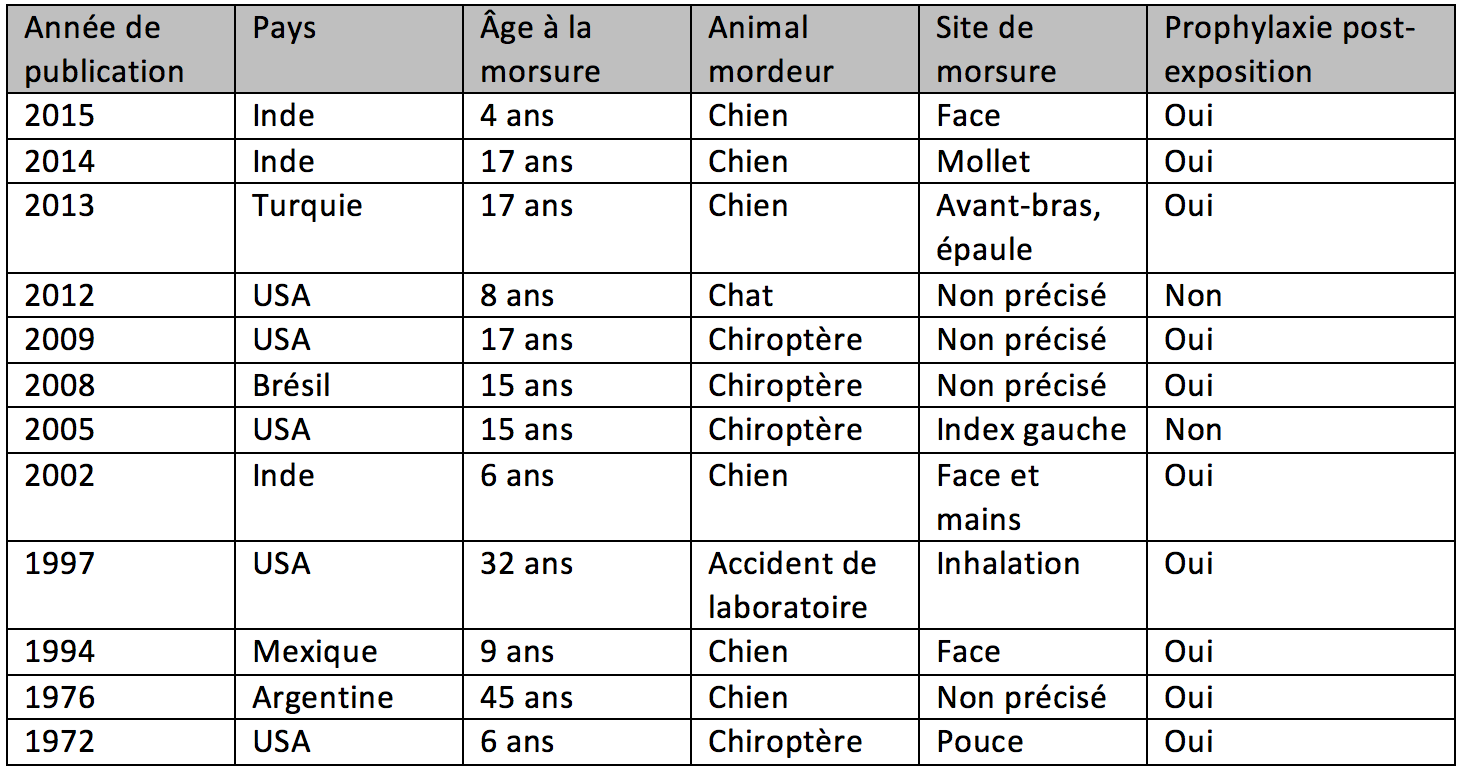 Ce cas est le 11e cas de survie à moyen terme à la rage après l’apparition de signes clinique à être décrit dans la littérature. La compilation de ces cas exceptionnels révèle que dans un petit tiers d’entre eux (4/11), la survie s’est faite sans séquelles. Les autres avaient des séquelles neurologiques modérées à sévères (comme le cas présent). Les morsures à la tête, au cou et aux mains sont classiquement associées à des encéphalites virales à brève période d’incubation. Pourtant, 8 des 11 survivants décrits présentaient de telles morsures.