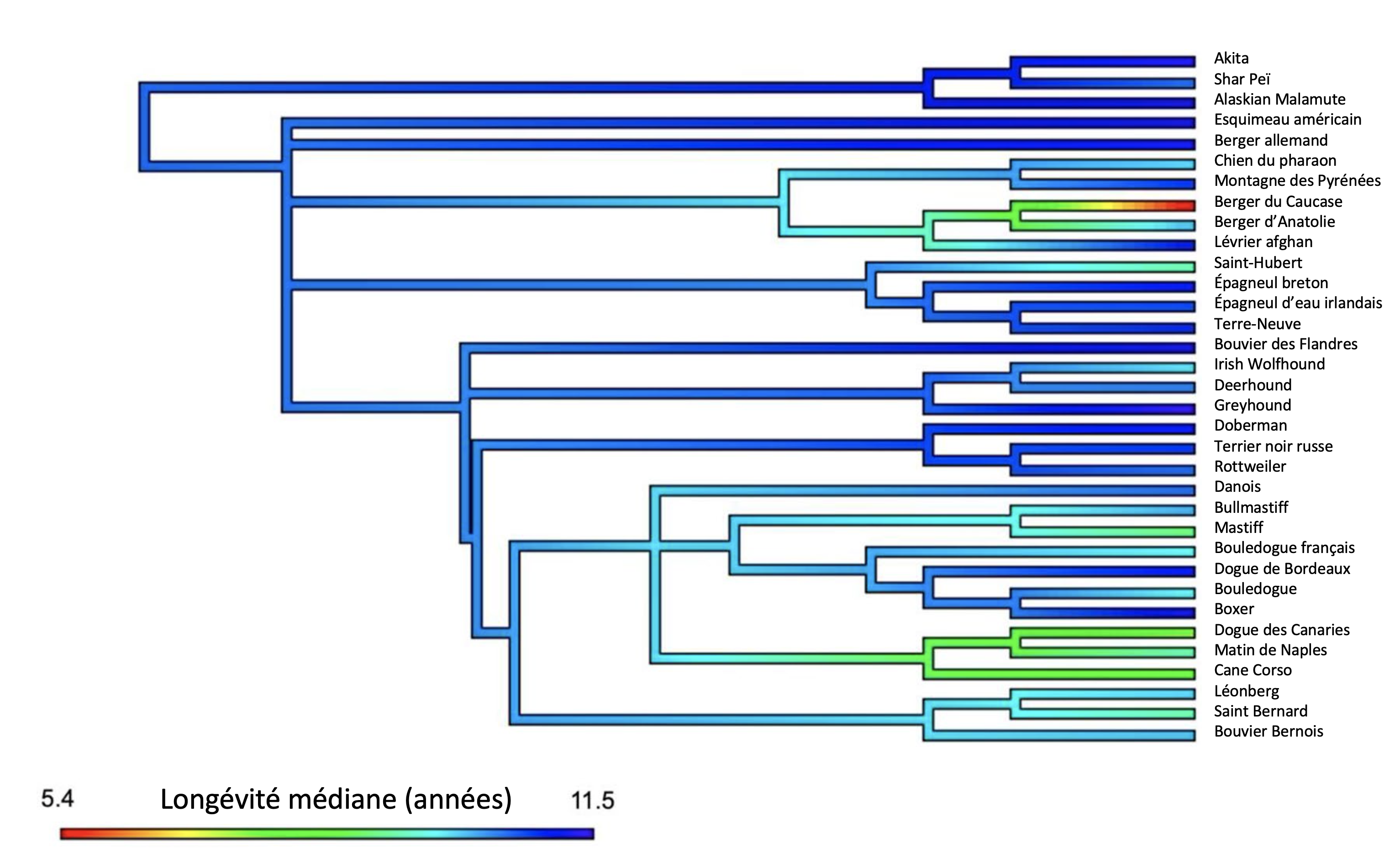 Seul un quart (25,8 %) des 155 races de l'effectif ont une espérance de vie médiane inférieure à celle des croisés (voir l'illustration principale). Pour un autre quart, il n'y a pas de différence, tandis que pour près de la moitié (47,1 %), elle est significativement plus élevée. Lorsqu'ils calculent le risque de décès précoce par rapport à un chien croisé, les auteurs obtiennent : le dogue des Canaries (risque x 3,0 et âge médian au décès de 7,7 ans), le berger du Caucase et le cane Corso (x 2,4 et âge médian au décès de 5,4 ans), devant le Mastiff (x 2,3 et âge médian au décès de 9 ans), le bouledogue français (x 2,2), le matin de Naples et le bouledogue (x 1,8), le Sant Bernard, le Saint Hubert et l'Affenpinscher (x 1,7). Le risque relatif de décès précoce du berger du Caucase est moindre que celui du dogue des Canaries, mais sa longévité médiane est significativement plus faible : c'est bien le plus mal loti à cet égard. À l'inverse, les races présentant la longévité la plus élevée sont le Lancashire Heeler (âge médian au décès de 15,4 ans), l'épagneul tibétain (15,2 ans) et le Shiba Inu (14,6 ans). Pour les races de grande taille, le nombre de décès s'accroît à partir de 11,9 ans et la médiane de survie est à 12,5 ans (contre 12,7 ans pour les races de plus petit format, prises ensemble).