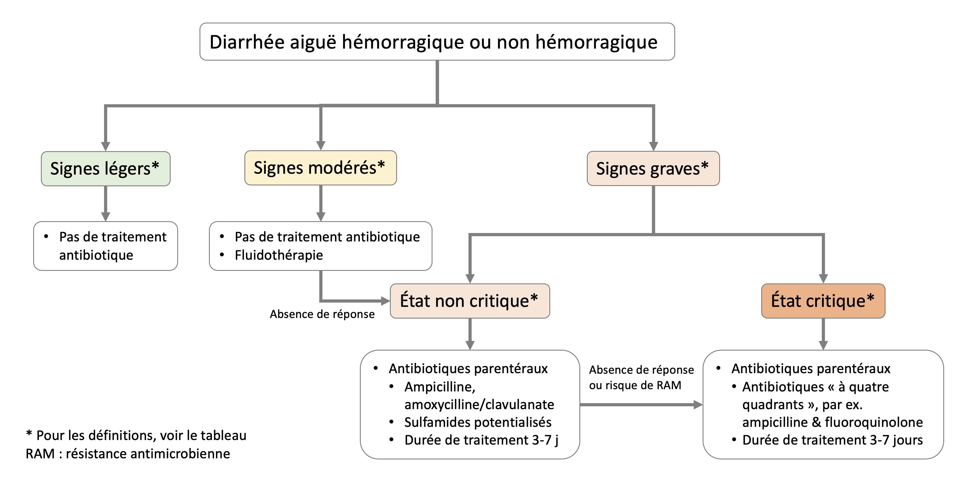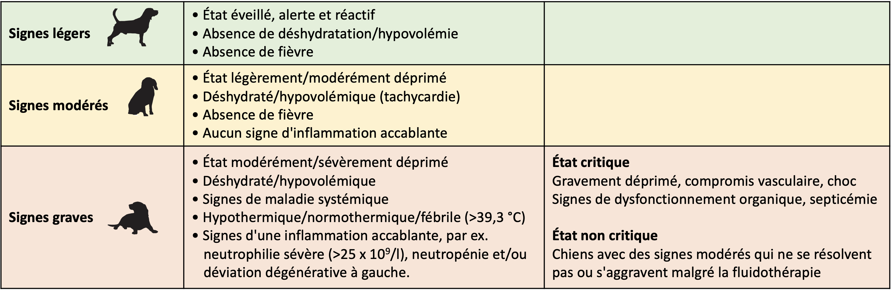 Les chiens diarrhéiques présentant des signes graves constituent une petite minorité des cas (< 1 %) et sont l'exception à la règle. Même si les auteurs reconnaissent « qu'il est difficile de faire la distinction entre les animaux qui bénéficieront ou non des antimicrobiens chez les chiens atteints d'une maladie grave », ils estiment que « la non-prescription d'antimicrobiens peut présenter un risque de progression de la maladie vers la septicémie ou d'autres conséquences infectieuses chez certains chiens ». En conclusion, « l'effet bénéfique des antimicrobiens, bien qu'il n'ait été étudié dans aucun essai, devrait être considéré comme probable » dans ces cas. Chez les chiens à signes graves mais dans un état non critique (voir le tableau ci-dessous), le panel recommande préférer l'ampicilline (ou bien l'amoxicilline/acide clavulanique) ou les sulfamides potentialisés (triméthoprime) en traitement de première intention. Chez les chiens à signes graves et dans un état critique ou si une résistance aux antimicrobiens est probable, un protocole à « quatre quadrants » est recommandé. Un tel protocole devrait assurer une couverture pour les pathogènes Gram positif, Gram négatif, aérobie et anaérobie, par exemple de l'ampicilline ou de la clindamycine associée à une fluoroquinolone ou à de la gentamicine. Les auteurs soulignent que la thérapie antimicrobienne ne doit pas s'étendre au-delà de la résolution des signes cliniques, et que 3 à 7 jours sont considérés comme « adéquats » pour la plupart des chiens.