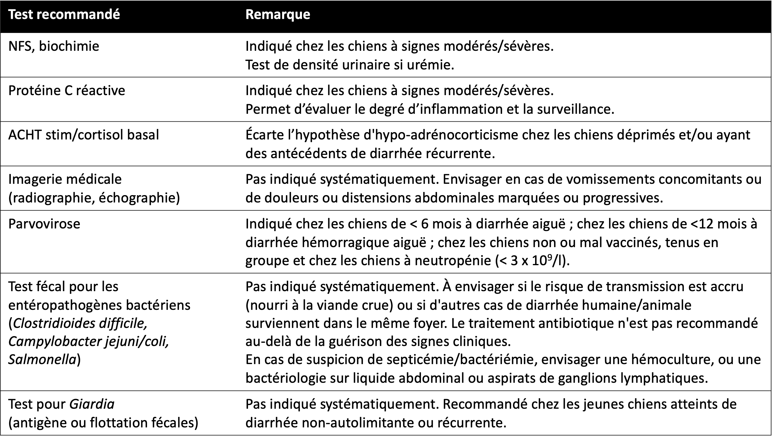 Le panel fournit également des conseils sur l'approche diagnostique en matière de diarrhée aiguë (voir le tableau ci-dessous), mais précise que ces recommandations ne sont pas le résultat d'un examen systématique, « simplement un avis d'experts ». Une diarrhée aiguë accompagnée de signes cliniques légers est souvent une maladie autolimitante ne justifiant pas d'exploration approfondie. Cependant, la numération-formule sanguine et la biochimie sont indiqués chez les chiens à signes modérés voire sévères. Chez les chiens présentant un état mental dépressif et des signes systémiques, la protéine C-réactive (CRP) peut être utile pour surveiller l'évolution de la maladie. Une diarrhée aiguë légère ou des épisodes récurrents peuvent justifier un test d'hypoadrénocorticisme. Bien que cela ne soit pas systématiquement indiqué, l'imagerie médicale de l'abdomen doit être envisagée chez les chiens ayant des vomissements non-transitoires concomitants, ainsi que chez les chiens présentant des douleurs abdominales ou une distension marquées ou progressives. Le dépistage de la parvovirose est indiqué chez les chiots (< 6 mois) à diarrhée aiguë, chez les jeunes chiens (< 12 mois) avec une diarrhée hémorragique aiguë, chez les chiens non ou insuffisamment vaccinés de tout âge, et chez les chiens à neutropénie.