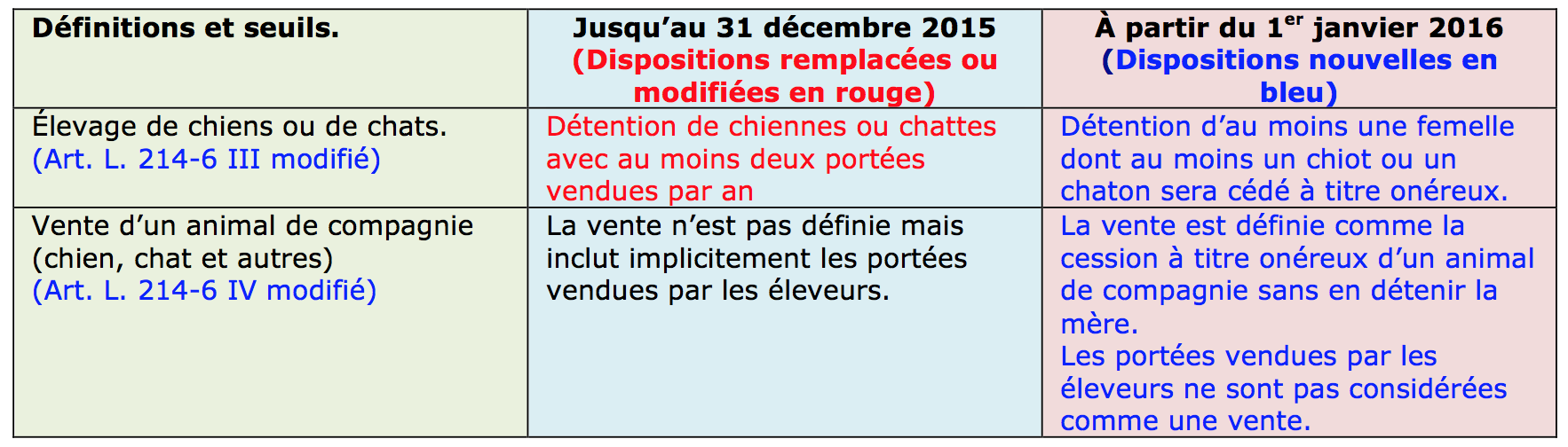 Jusqu’au 31 décembre 2015, l’élevage de chiens et de chats consiste en la détention d’au moins une femelle reproductrice et à la vente d’au minimum deux portées par an. En dessous de ce seuil, la vente occasionnelle d’un chiot ou d’un chaton issu d’une seule portée par an, voire d’une gestation accidentelle, n’était pas rattachée à la notion d’élevage.
