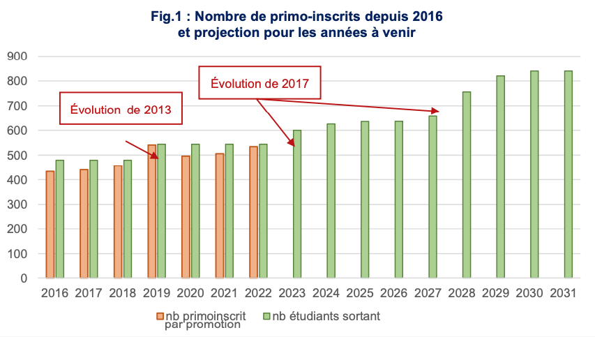 Actuellement, 800 à 950 jeunes Français sont formés à l'étranger, et ce nombre est susceptible d'augmenter ! Le nombre total de jeunes diplômés entrant sur le marché de l'emploi est ainsi estimé à 1600-1800 à horizon 2030, au minimum. Il convient d'y ajouter les diplômés de nationalité étrangère venant travailler en France (belges, italiens, espagnols), qui représentent 18 à 20 % des primo-inscrits au tableau de l'Ordre (soit environ 200 par an).