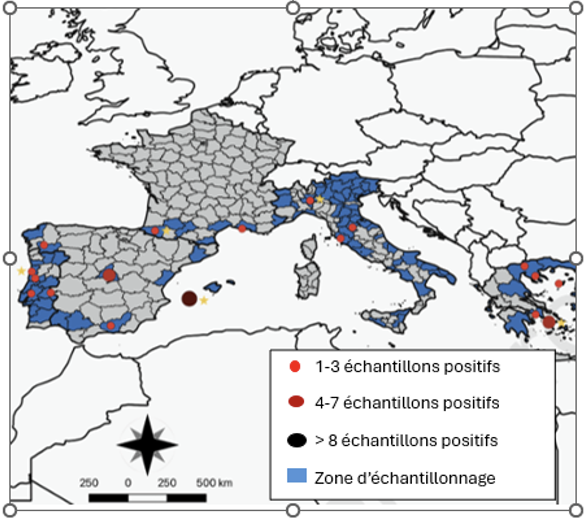 Au total, 3,8 % des chats prélevés (n=41 /1 083) présentaient au moins un test positif à la dirofilariose. Les prévalences variaient de 2 % en France et en Israël, à 7,8 % en Grèce, avec de fortes variations locales. Ainsi, la prévalence s'élevait à 20 % sur l'île d'Ibiza (contre 4 % en moyenne en Espagne), 13 % sur l'île de Kythnos en Grèce, et 18 % sur l'île de Linosa en Italie (contre 5 % au niveau national). Toutes trois situées entre le 35ème et le 38ème parallèle, ces îles offrent probablement un contexte épidémiologique favorable à la transmission parasitaire (développement et survie des moustiques vecteurs, stabilité des populations d'hôtes). Sur les 41 positifs, 23 présentaient uniquement des anticorps contre Dirofilaria sp., 10 présentaient à la fois des anticorps et un résultat positif à la PCR ou au test antigénique et 8 étaient positifs en PCR ou au test antigénique sans séropositivité. Seize chats étaient infestés par Dirofilaria immitis, et 2 par D. repens (test antigénique et/ou PCR). Enfin, huit chats positifs à la dirofilariose l'étaient également à la leishmaniose à Leishmania infantum.
