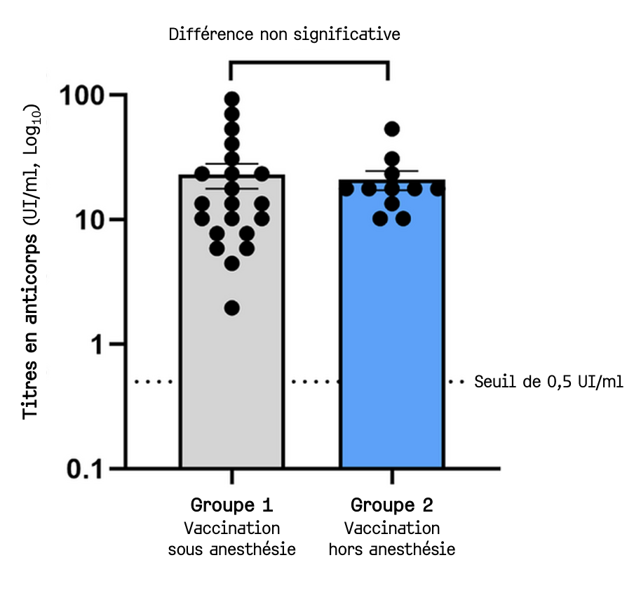 Le protocole anesthésique (prémédication à la médétomidine et méthadone, induction au propofol puis maintenance à l'isoflurane) et analgésique (morphine et buprénorphine), comme le protocole de vaccination (vaccin inactivé et adjuvé contre la rage, sans autre valence associée), étaient identiques dans les 2 groupes. Et les titres en anticorps antirabiques avant vaccination étaient identiques (chats séronégatifs).