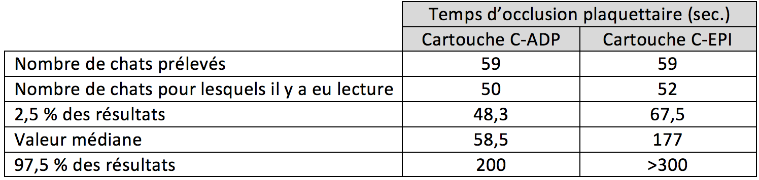 L'analyseur PFA-100° mesure le temps d'occlusion plaquettaire sur sang total (tube citraté). Il utilise indifféremment deux types de cartouches (collagène-ADP ou collagène-épinéphrine). L'analyse doit être réalisée moins de 3 h après le prélèvement. Avec la première cassette (C-ADP), les valeurs de référence du temps d'occlusion plaquettaire (2,5 à 97,5 % de la population testée) sont de 48,3 à 200 secondes. Toutefois, avec la seconde cassette (C-EPI), il n'a pas été possible de déterminer ce paramètre (temps supérieur au maximum de celui pris pour l'analyse). De plus, et malgré plusieurs tentatives, il n'a pas été possible d'effectuer l'analyse pour 15 % des chats (voir le tableau ci-dessous), ce qui est cohérent avec d'autres publications. Ainsi, les auteurs ont retenu la cartouche C-ADP pour évaluer l'effet du clopidogrel sur la fonction plaquettaire.