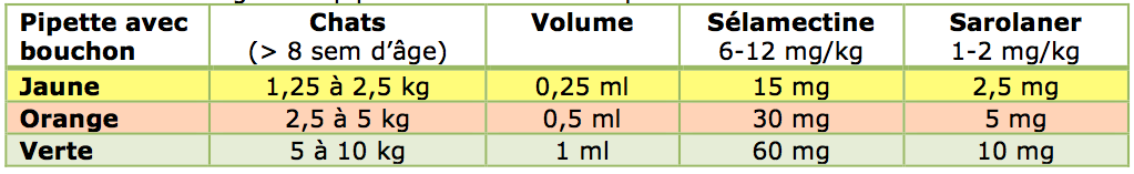 La sélamectine est un endectocide dont l'efficacité est déjà démontrée dans la gamme Stronghold° chez les chats contre les puces, les poux broyeurs, la gale d'oreilles et les nématodes (ascaris, ankylostomes, dirofilariose). Dans Stronghold° Plus, la sélamectine, employée à la même posologie (au moins 6 mg/kg), conserve les mêmes indications. Les dosages des nouveaux spot-on (15, 30 et 60 mg de sélamectine) sont toutefois un peu différents de ceux dans la gamme Stronghold° (15, 45 et 60 mg). Seul le tableau des poids des chats à traiter en fonction du dosage de la pipette change donc aussi.